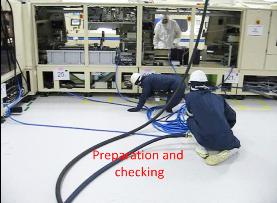 In the cleanroom, we moved a complete unassembled gluing line with a length of 30.8 metres and a weight of 20.45 tonnes using air cushions. As you can see, we settled the line without any problems to within one millimetre. We also relocated an infeed and outfeed conveyor weighing 27.5 tonnes. We used several sets of air cushions to move it.